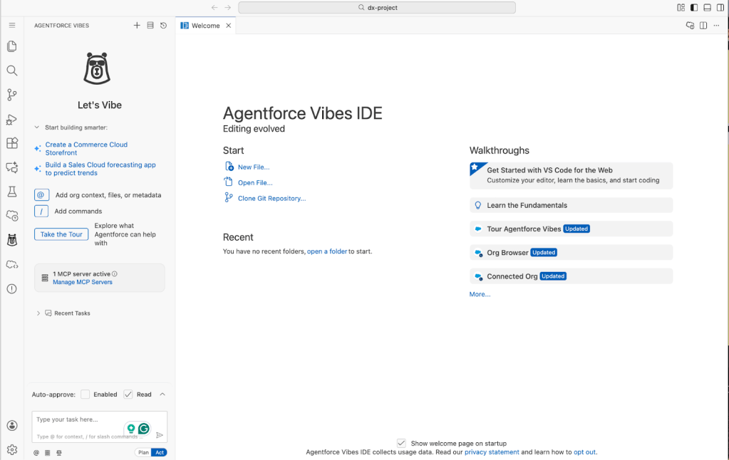 Getting started is actually pretty straightforward. Agentforce Vibes can be used either through a dedicated Integrated Development Environment (IDE) or as an environment in Salesforce itself. If you choose to go with Agentforce Vibes in the web browser, it will look like this, allowing you to vibe code right in your org (preferably a sandbox). Either way you set it up, you just have to click the AgentForce Vibes icon to get to vibe coding.