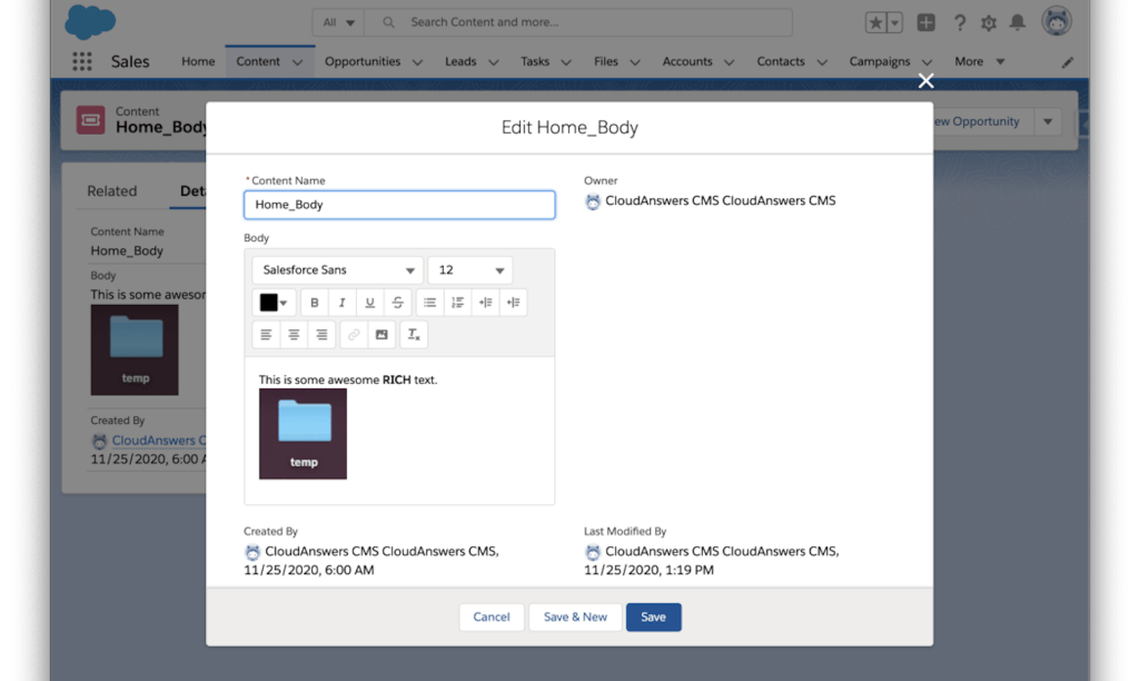If you don’t need multiple sites or complex rules on content types (or just want to start simple) then you can start with a single object named “Content” (Content__c) with a single field named “Body” (rich text).