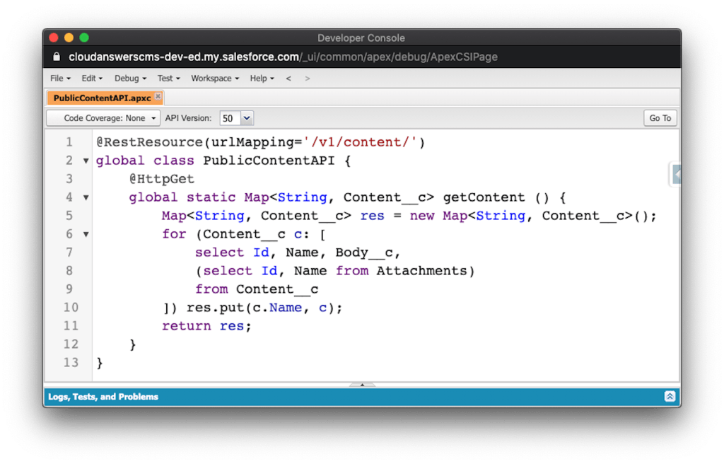 To expose this data (in the simplest way possible) we are using an Unauthenticated Apex Rest Webservice hosted on a Force.com site: