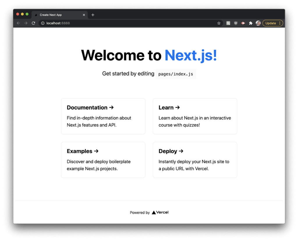 Finally, we can start building the site. For our example, we ran the nextjs project starter tutorial to get a basic site: