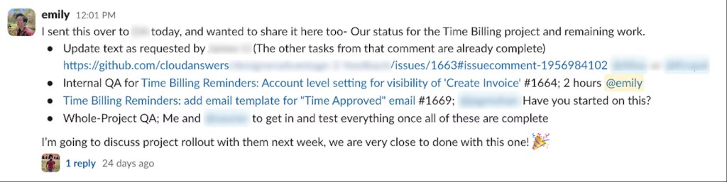 As the Project Manager, these standup messages and meetings are a great way for me to catch up and plan my day. I’ll see the work that happened while I was sleeping, and be tagged when someone has a question or has something ready for me to review.