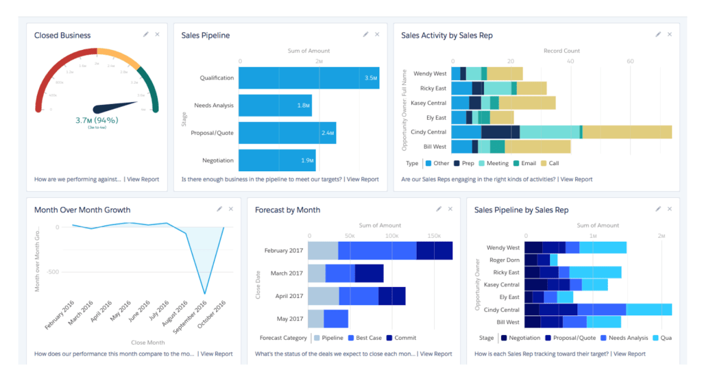 Much like your car’s dashboard, a Salesforce dashboard visually provides information- quickly and easily. Dashboards can be created for anything that you are tracking in Salesforce. They can even be customized for different business units or job roles. In this post, we’ll explain some basics of Dashboards in Salesforce and then review some common elements in a Sales dashboard.