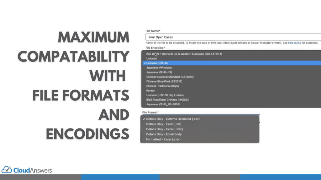 - International and legacy system support: Change file encoding directly from the report schedule to support special characters, multiple languages, and file formats used by old legacy systems who have not updated to UTF-8.
