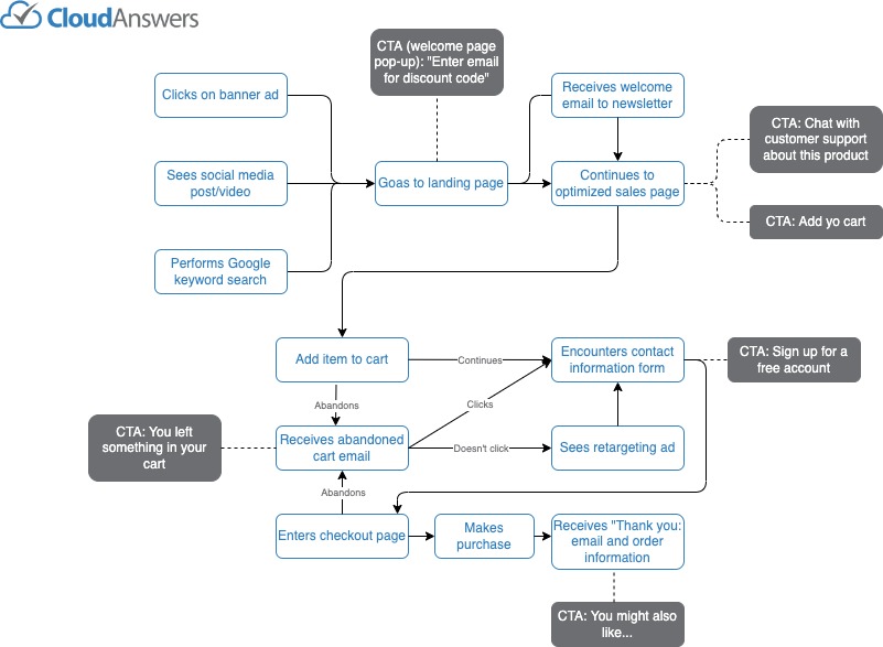 In this flow, there are on-page pop-ups, emails, and social media retargeting ads to reduce the number of people dropping out of the funnel.