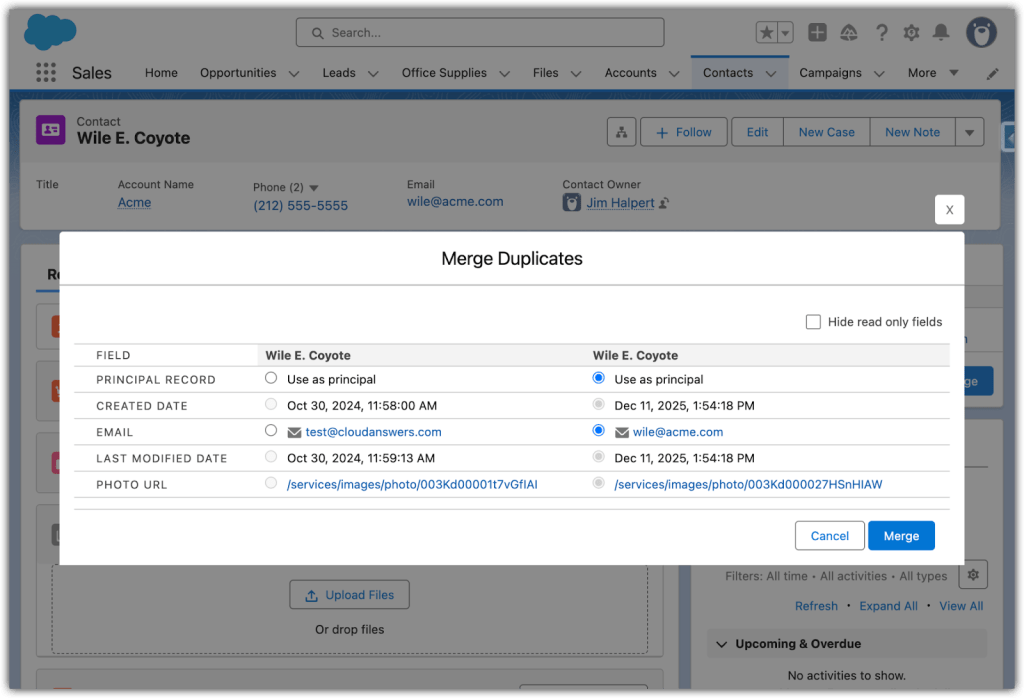 What’s really empowering is that users can merge duplicates right from the record page. The component guides you through selecting up to 3 duplicate records and choosing which field values to keep in the principal record. With just a few clicks, the duplicates are merged and cleaned up. This makes it super easy for everyday users, the ones who typically know the data best, to pitch in and maintain data hygiene as part of their everyday workflow. By surfacing possible dupes to your sales, marketing, and support folks in real time, the burden of cleanup no longer falls solely on periodic admin scrubbing – it becomes a collective effort.