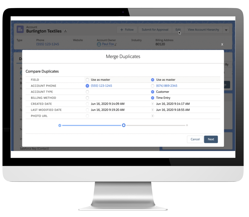 Choose the master record and the values you want to keep. We only show you the fields that are different, plus any fields you always want to see.